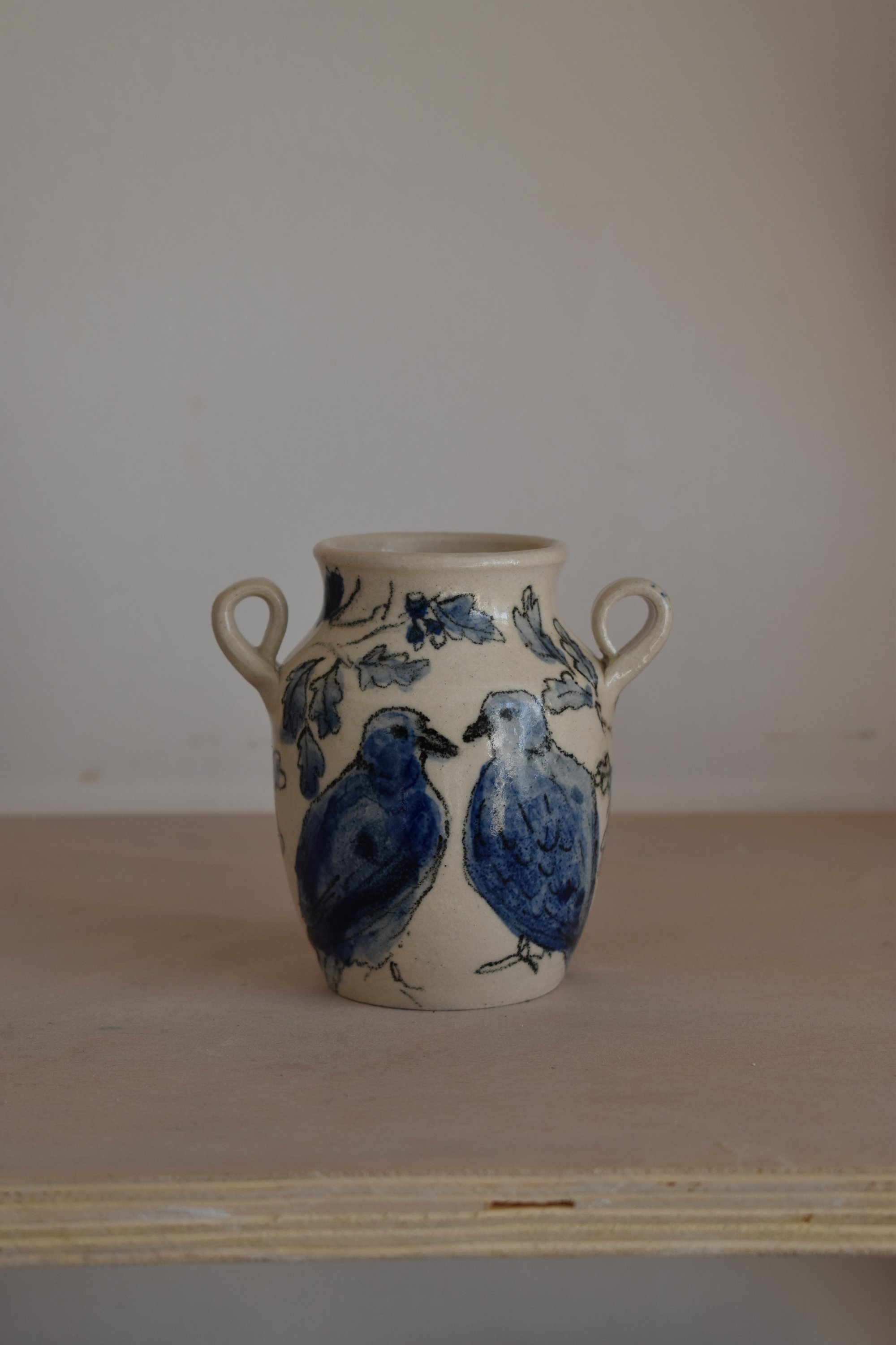 10.5cm tall Glazed stoneware with oxide illustrations.