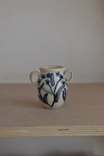 A small vase with handles with illustrated forget-me-nots on, as well as the phrase 'forget me not'