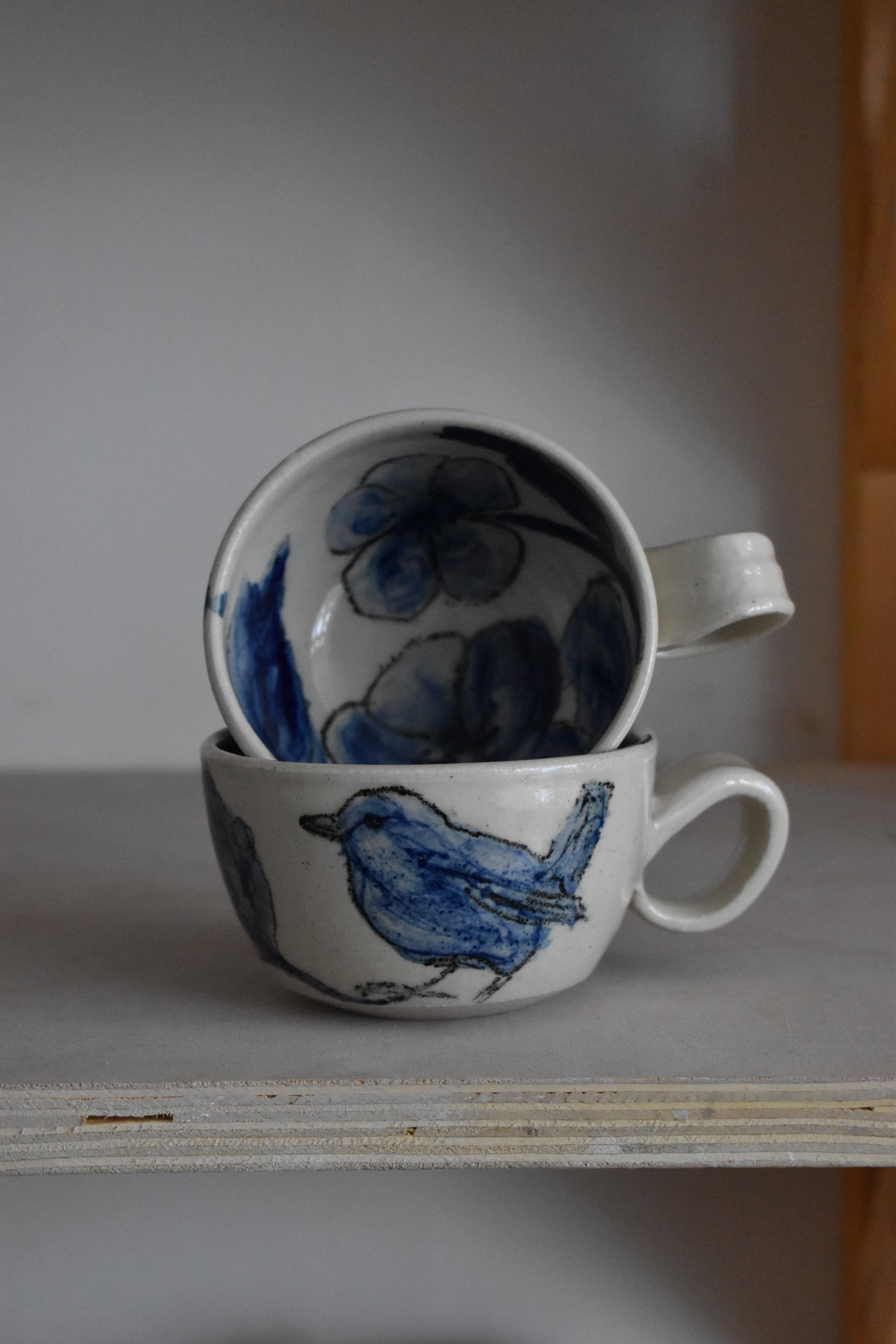 Stoneware coffee cups with hand-drawn blue-oxide drawings on.